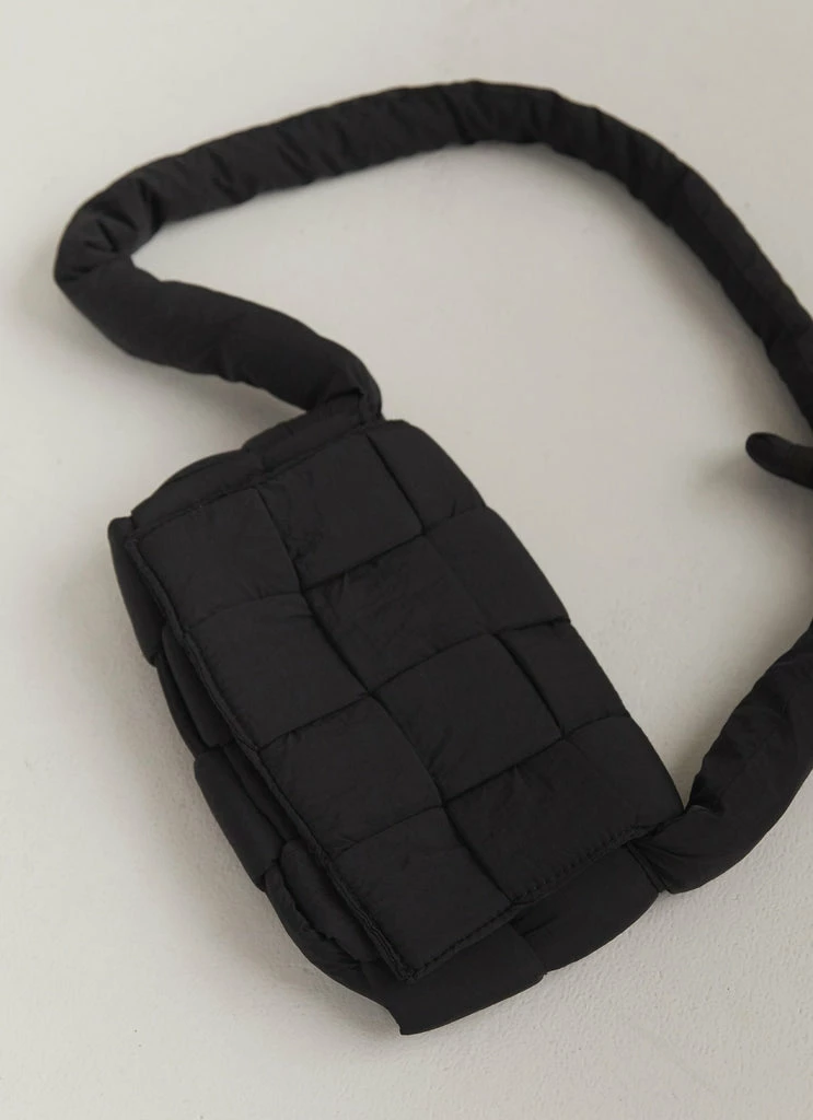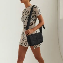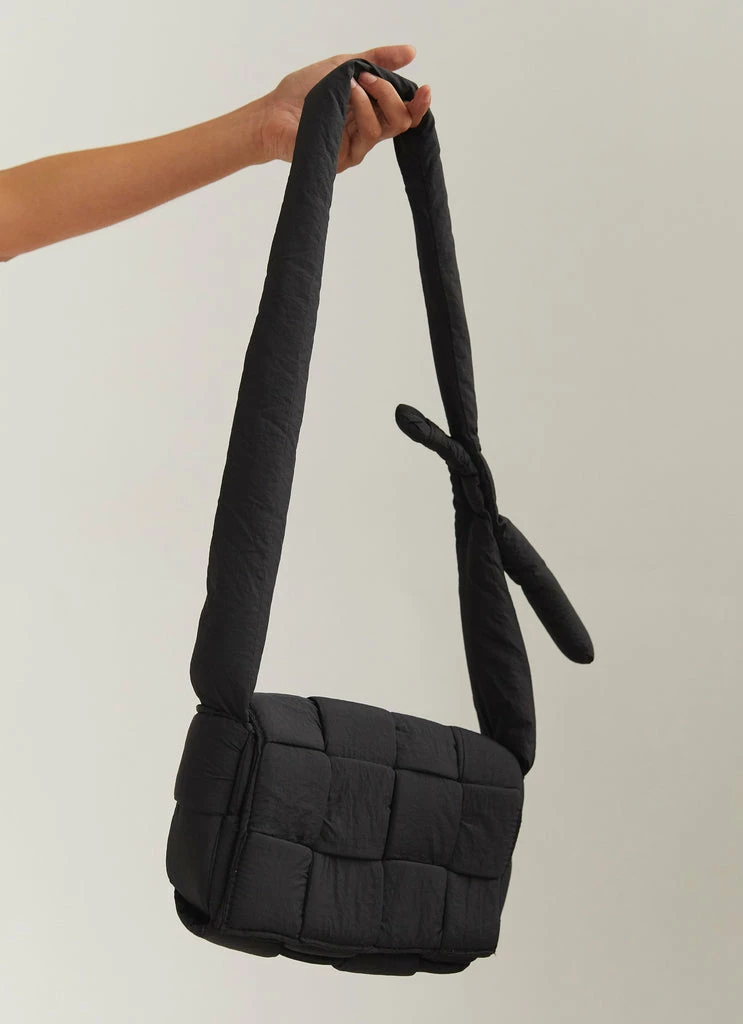The styling piece you need this season! The Moonbeam Crossbody Bag is a crossbody bag with puffer material strap and rectangle bag with flap closure that features woven pattern.